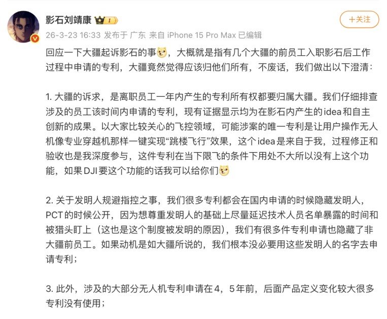 In response, Insta360 founder and CEO Jingkang Liu posted a public statement rejecting DJI’s accusations. Liu said the company conducted an internal review of patents filed by employees who previously worked at DJI and found that the ideas originated independently within Insta360. He added that the company routinely withholds inventor names in domestic filings to reduce headhunting risks and said that some listed inventions – such as a flight‑control feature enabling a one‑button “building dive” – were conceptual and not deployed in products.